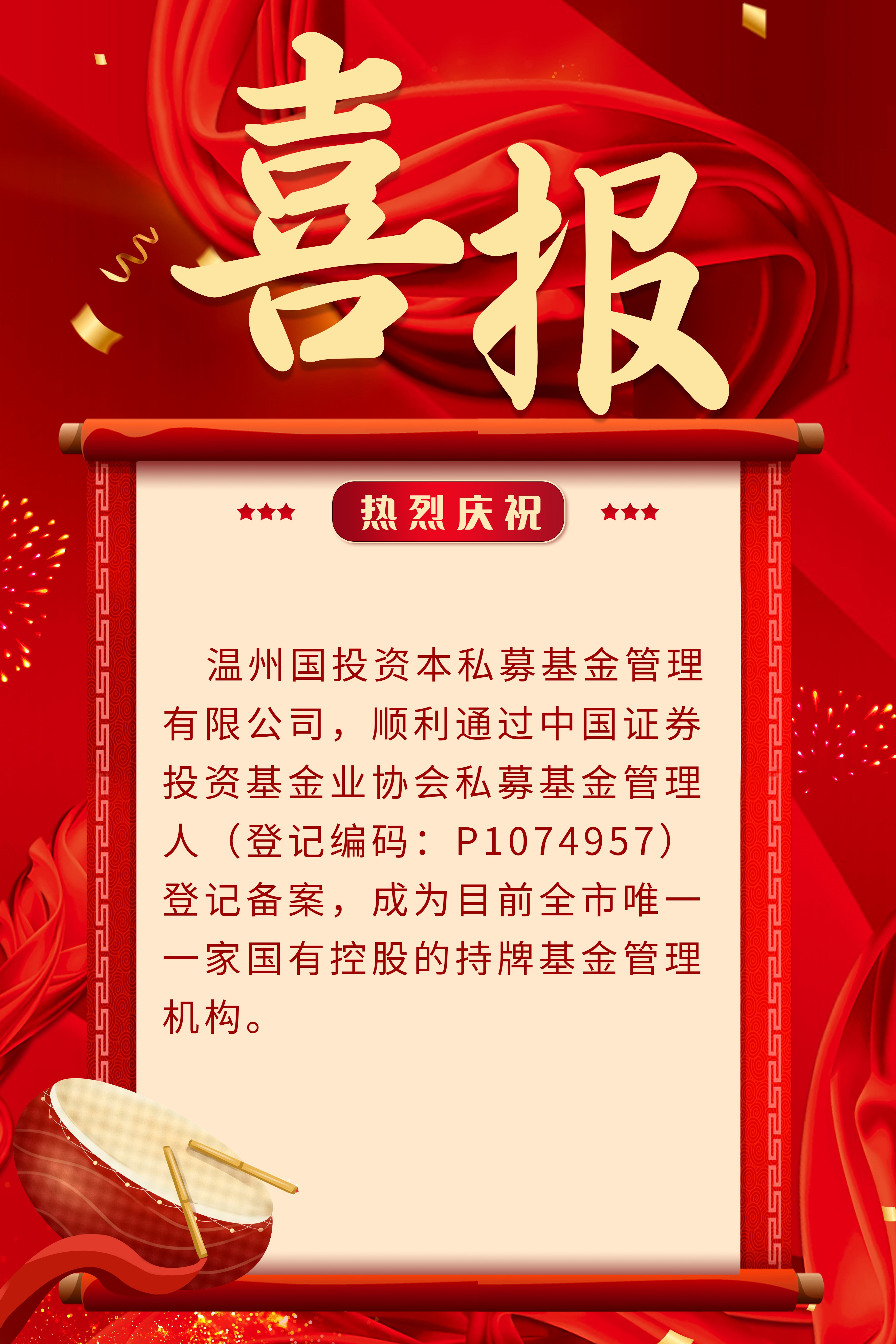 3月31日,在市委、市政府的堅(jiān)強(qiáng)領(lǐng)導(dǎo)下,在市政府辦公室、市國(guó)資委等相關(guān)部門的大力支持下,溫州市國(guó)有資本投資運(yùn)營(yíng)有限公司旗下溫州國(guó)投資本私募基金管理有限公司,順利通過中國(guó)證券投資基金業(yè)協(xié)會(huì)私募基金管理人(登記編碼:P1074957)登記備案,成為目前全市唯一一家國(guó)有控股的持牌基金管理機(jī)構(gòu),標(biāo)志著溫州國(guó)資在私募基金投資業(yè)務(wù)牌照上實(shí)現(xiàn)了零的突破,為市屬國(guó)資國(guó)企改革和“大國(guó)投”平臺(tái)打造注入強(qiáng)勁的動(dòng)能。